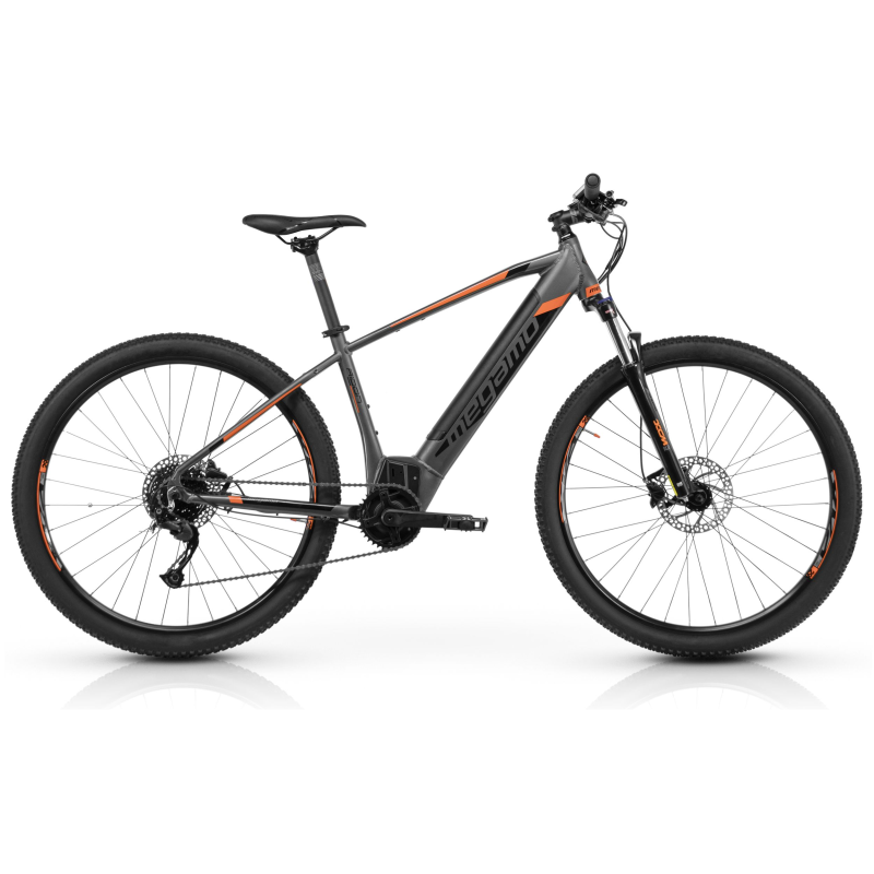 Bicicleta eléctrica de montaña Full Suspensión con motor central Shimano y cuadro de aluminio Megamo Crave Al 10, disponible en color Tiger Orange, Black y Pagoda Black Mate.