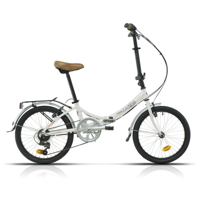 Bicicleta plegable Megamo con cuadro de aluminio 6061, horquilla de acero, transmisión Shimano TY21 de 6 velocidades y potencia regulable. Equipada con guardabarros y portabultos trasero.