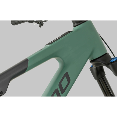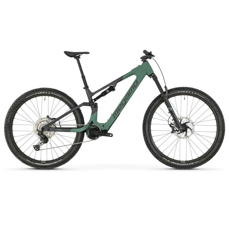 Bicicleta eléctrica Megamo con cuadro de aluminio, horquillaa FOX 36 Performance 160mm, amortiguador FOX Float X Performance, transmisión Sram 90 Eagle T-Type 12v, motor central DJI Avinox M1 120Nm y batería integrada de 850Wh.