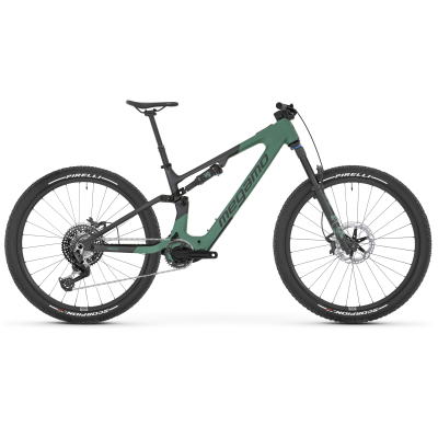 Bicicleta eléctrica Megamo con cuadro de aluminio, horquillaa FOX 36 Performance 160mm, amortiguador FOX Float X Performance, transmisión Sram 90 Eagle T-Type 12v, motor central DJI Avinox M1 120Nm y batería integrada de 850Wh.