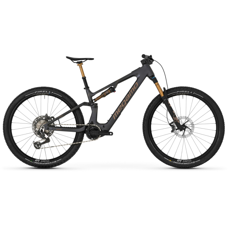 Bicicleta eléctrica Megamo con cuadro de aluminio, horquilla FOX 36 SL Kashima 140mm, amortiguador FOX Float Kashima, transmisión Shimano XT 12v, motor central DJI Avinox M1 120Nm y batería integrada de 850Wh.