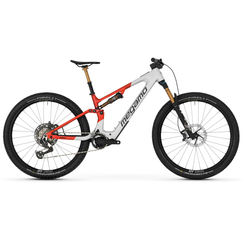 Bicicleta eléctrica Megamo con cuadro de aluminio, horquilla FOX 34 Performance 140mm, amortiguador FOX Float Performance, transmisión Sram 90 Eagle T-Type 12v, motor central DJI Avinox M1 120Nm y batería integrada de 850Wh